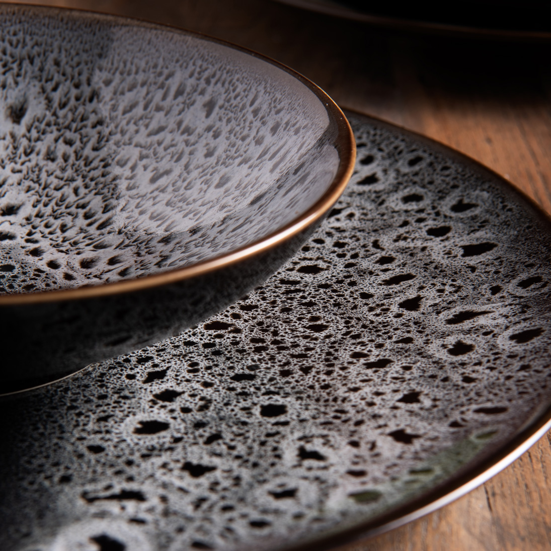Les textures contrastées et les effets de matière donnent à chaque pièce une identité unique. Entre sobriété et intensité, Kyle évoque une beauté brute, discrète et élégante, idéale pour une table moderne et assumée.
