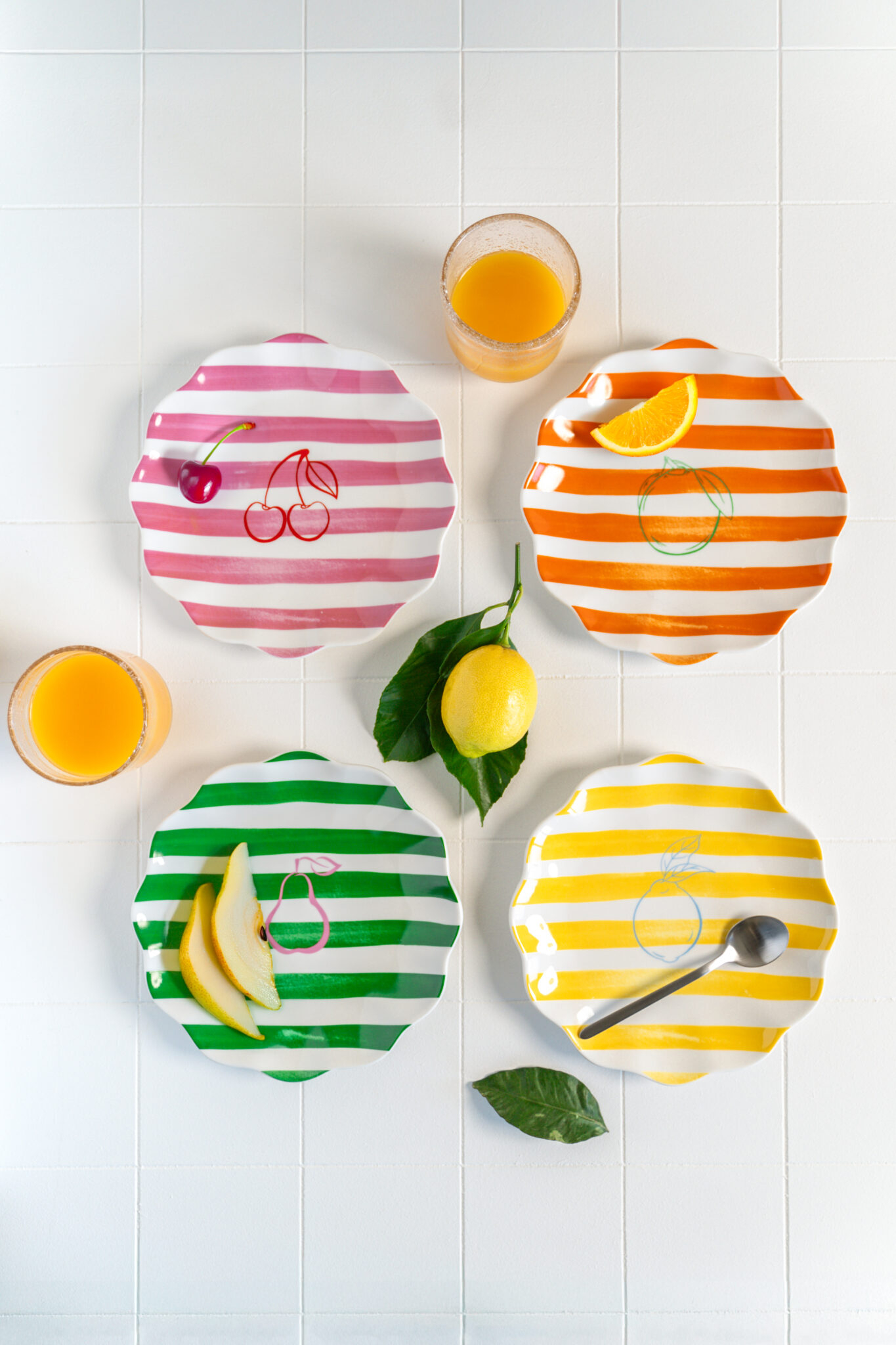 La collection Tutti Frutti se distingue par ses rayures colorées et ses illustrations de fruits emblématiques. Citron jaune, poire verte, orange juteuse et cerise rose : chaque assiette incarne une personnalité différente, créant une table ludique et vitaminée.